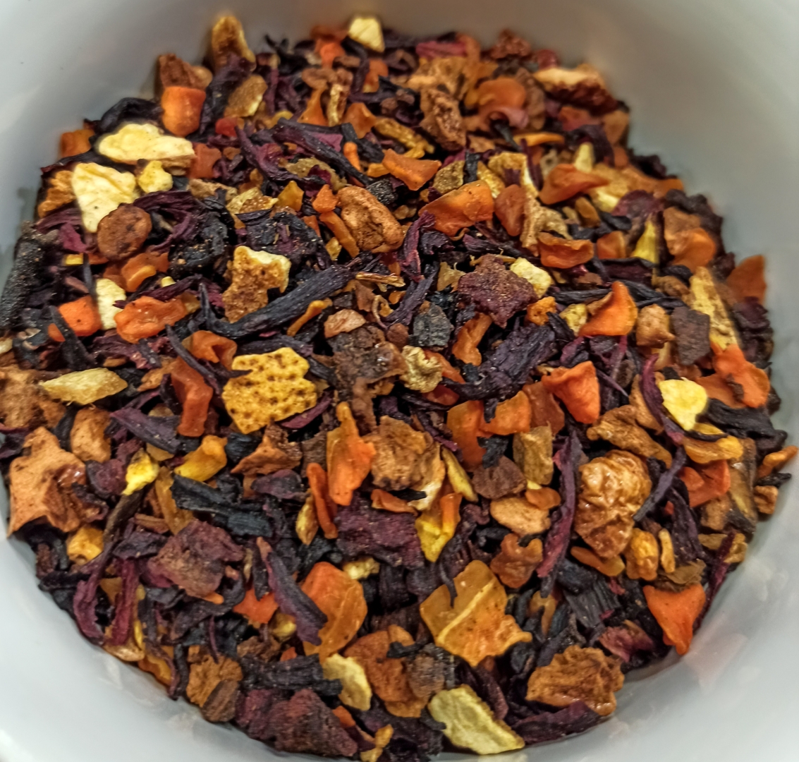 Zutaten: Hibiskusblüten, Karottenstücke, Apfelstücke, Rote Beetestücke, Orangenschalen (6%), Zimtrinde (6%), Ingwerstücke, natürliches Orangenöl, natürliches Gewürzaroma, Nelken