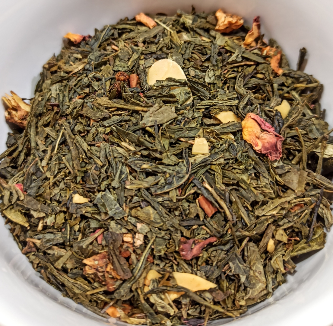 Zutaten: China Sencha, getrocknete Apfelstücke, Mandeln, Rosenblütenblätter, Aroma