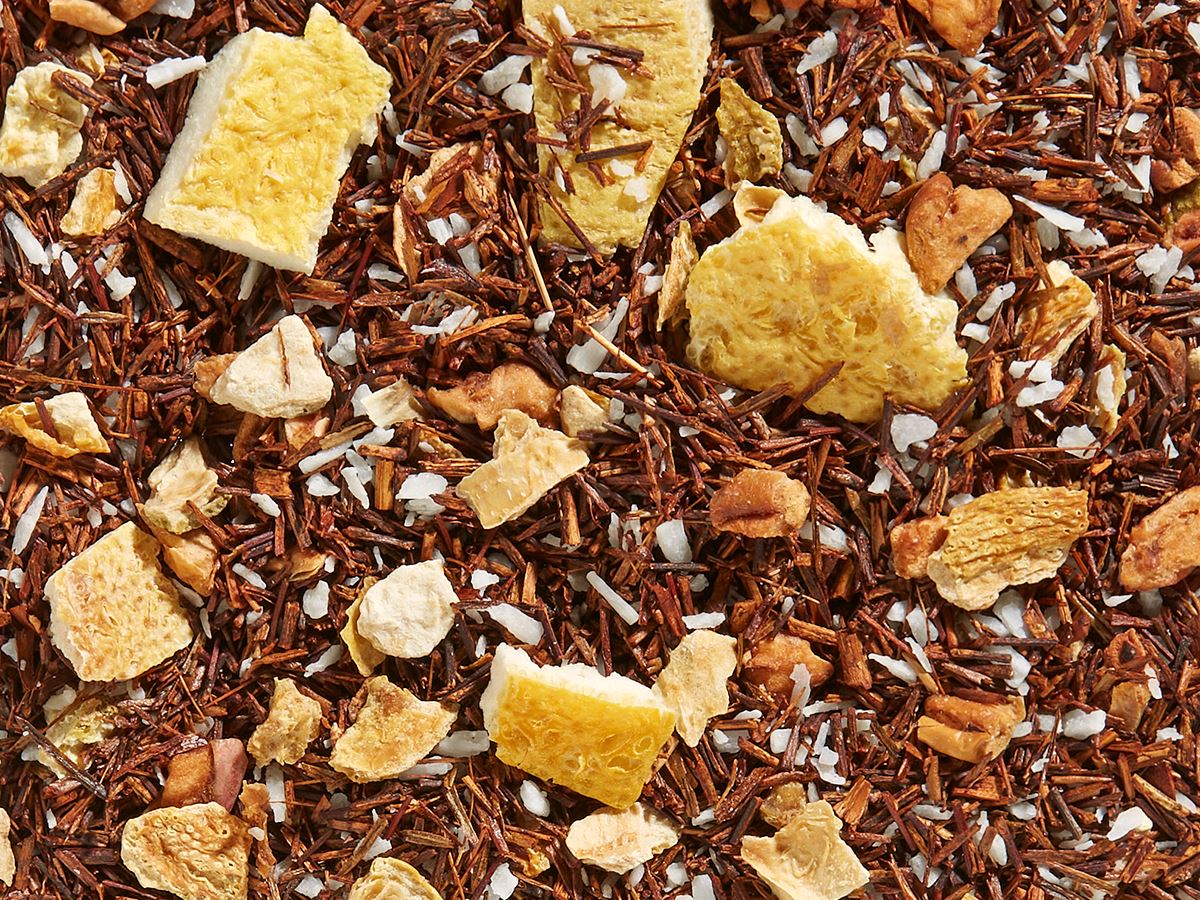 Zutaten: Rotbuschtee, Kokosraspeln, Zitronenschalen, Apfelstücke, Aroma, gefr.-getr. Zitronenschalen
